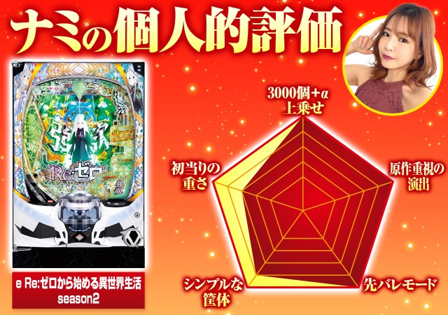 評判の良いアニメ2期の世界観を表現した演出作りはさすがで、レムが登場すればアツいのも原作のストーリーに沿っていてファンにとっては嬉しい要素ですね。シンプルで機能性の高い新筐体も好感触。大当り確率が1/349と軽くはないので、初当りを引けるかだけが不安です。