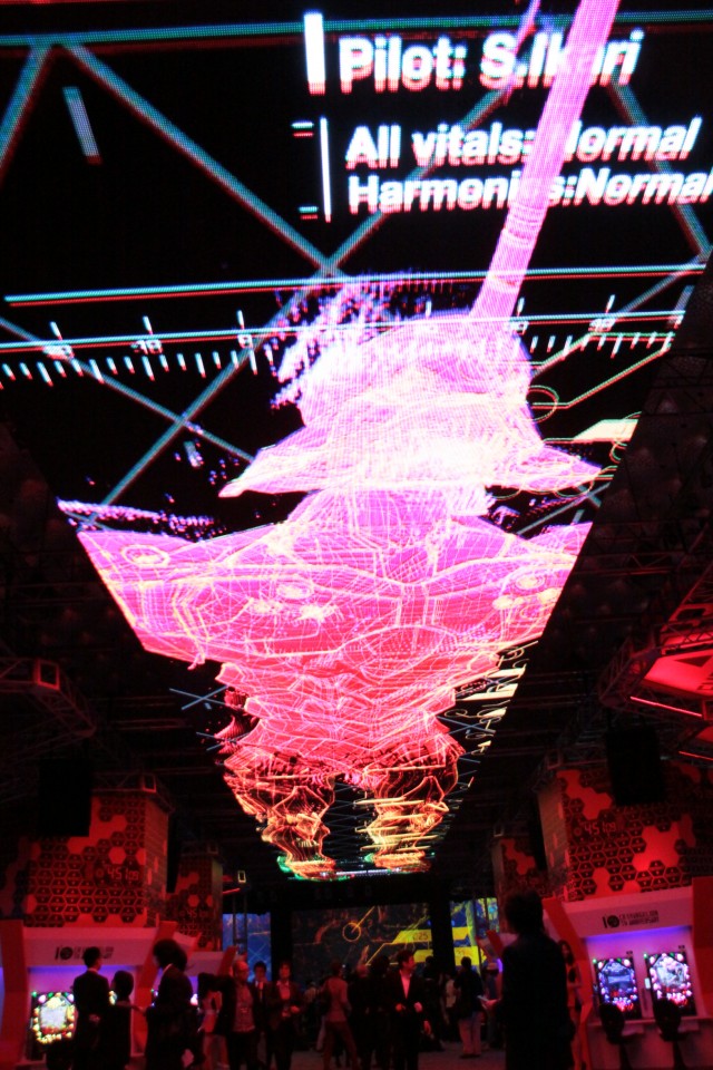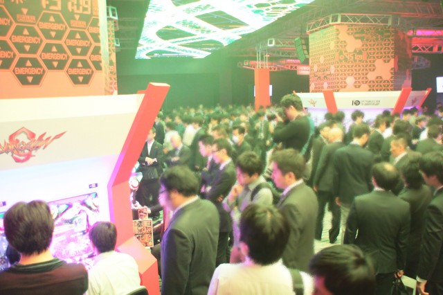 いよいよゲートオープンすると、奥行きのある開放的な試打・展示会場の天井には幅5m、長さ30mの巨大LED、さらにはステージ奥に大型3面スクリーンが配置され、凝った演出に本機への力の程が窺い知れる。