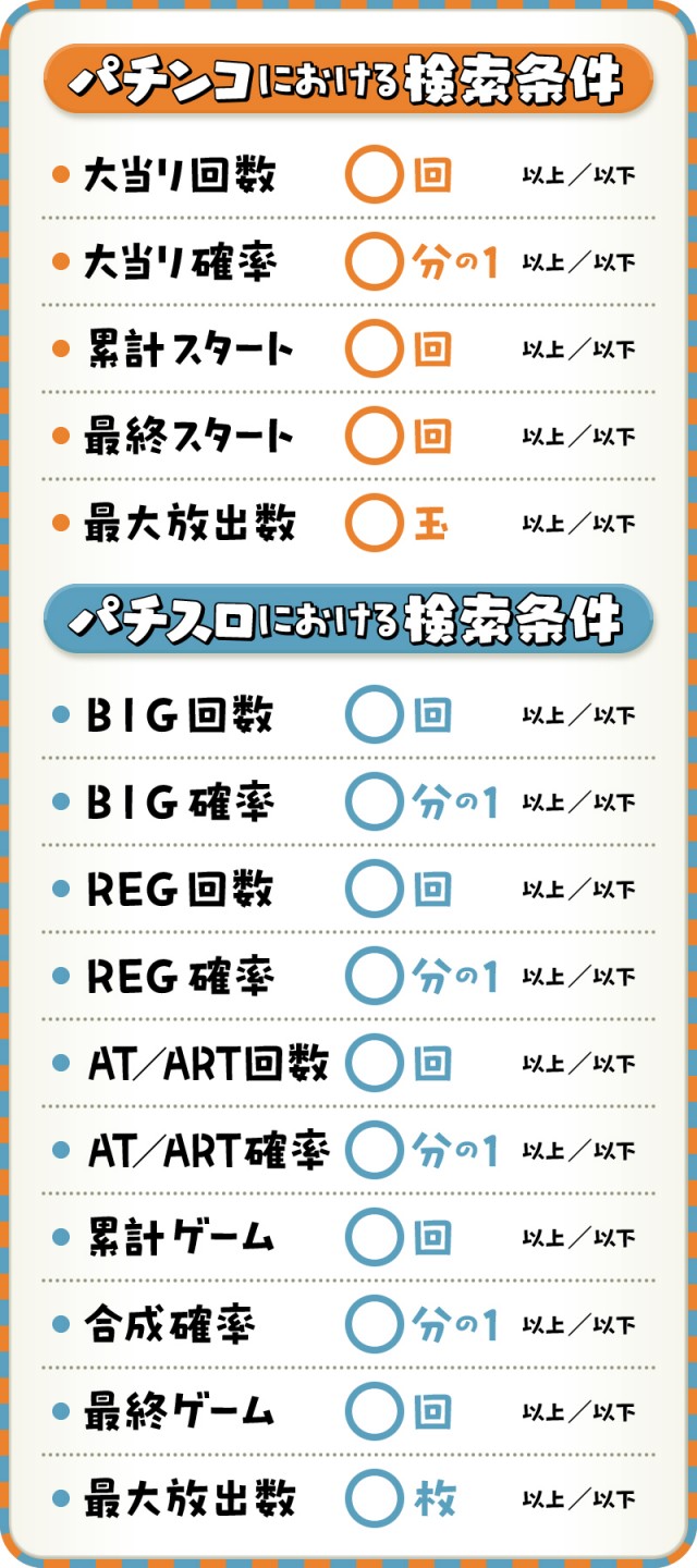 データ検索機能を駆使すれば、わざわざお店に出向くことなく指定した条件に合致する、優良台や天井間際のお宝台などがどこでも簡単に検索可能!