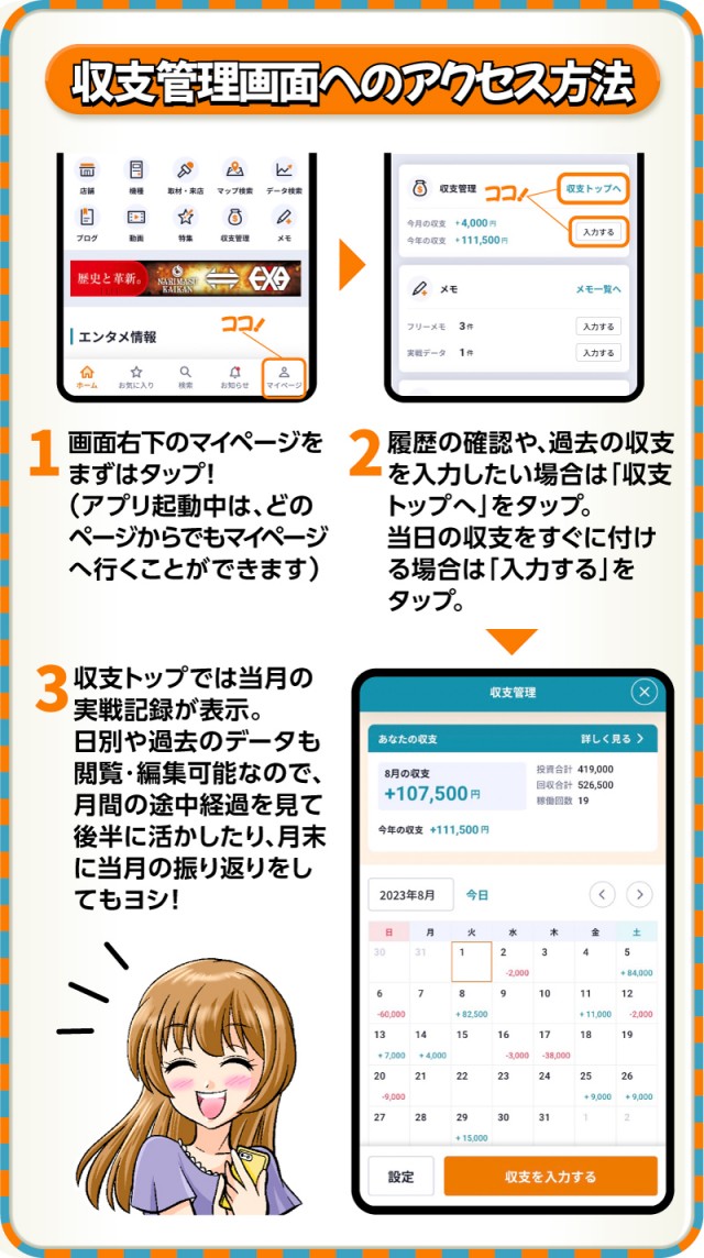 収支をこまめに付けることで、自分の実戦に無駄はないか? また普段は気付かない小さな情報からお店のクセや隠れた傾向などが見えてくる可能性があります。