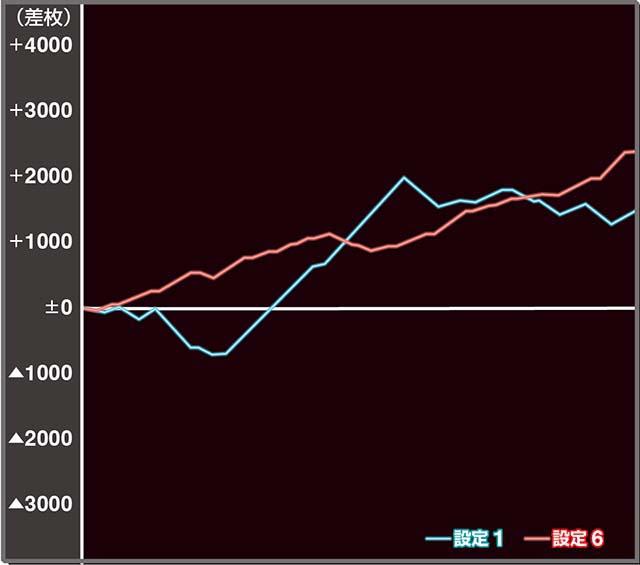 こちらは今回の設定1・6の実戦データのスランプグラフです。どちらもプラス域でフィニッシュしていますが、やはり設定6はきれいな右肩上がりの安定したグラフになっています。