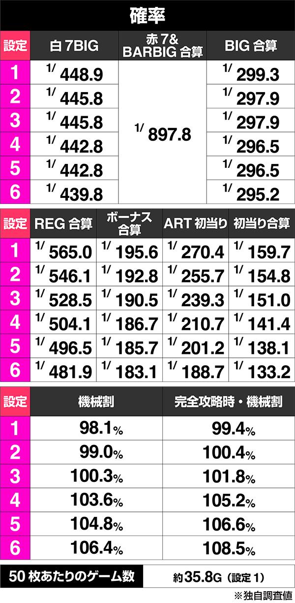 赤7&BARBIGのみ、全設定共通。その他には設定差が存在する。高設定ほど初当り合算が優秀なのは一目瞭然だ。