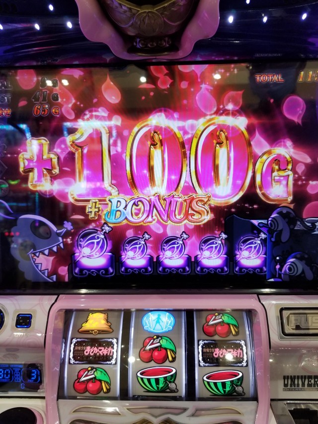 暫くするとキュゥべえチャレンジに突入し、気合を入れて回していると無演出で左リールがズルッとスベり上段にスイカが!(個人的に激しい音や光よりもこういったしれっと系が一番脳汁出ます)