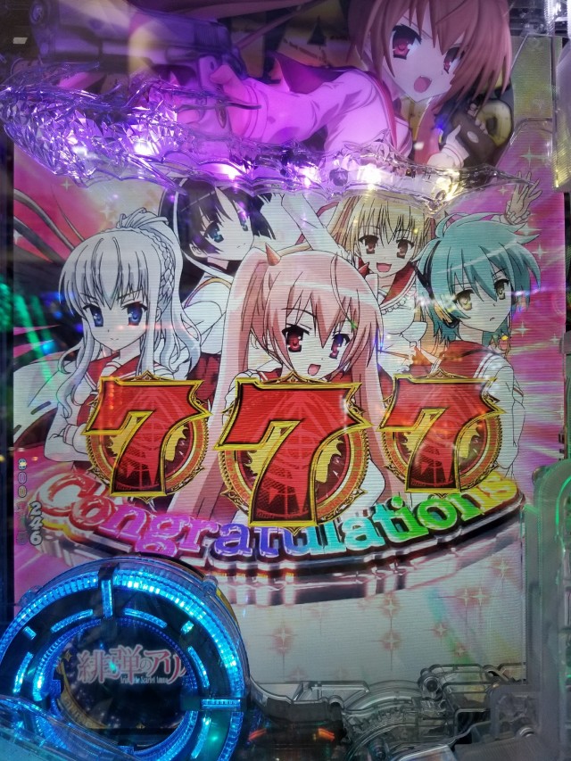 『P緋弾のアリア~緋弾覚醒編~319ver.』にて、 激熱アリアガバメントのハズレからヒロイン集結のCongratulationsで復活7大当りもゲットですねん!
