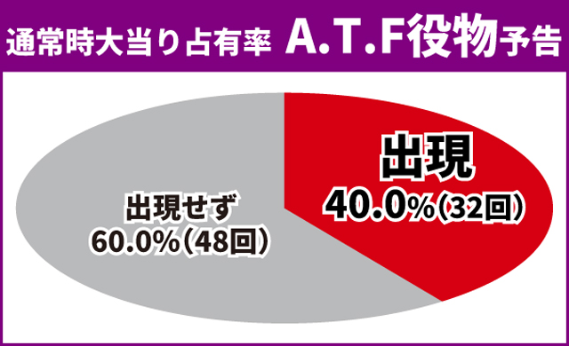 保留変化以外の先読み予告のトータル占有率は約48.8%で、保留変化予告よりも高数値をマーク。演出別に見れば「A.T.F役物予告」が32回出現とダントツのトップで、次が8回出現した「ガフの扉予告」だ。その他にも出現した先読み予告はあるが、いずれも出現回数は5回未満だった。