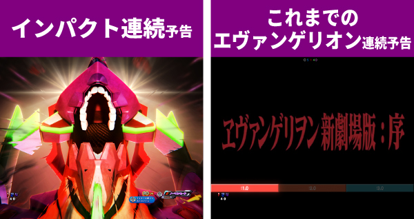 連続予告の中で最も多く出現したのが「インパクト連続予告」で、25回出現。2番手はガクッと下がって5回出現した「これまでのエヴァンゲリオン連続予告」だ。また上記表には入れていないが、ノーマルリーチハズレから保留が減らすに再変動する「サイレント連続予告」が1回出現している。