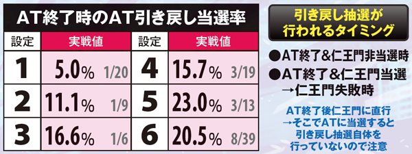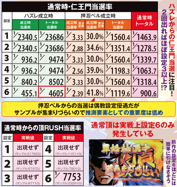 ハズレ時の仁王門当選率には大きな設定差があるため、一度でも確認できれば高設定の可能性がアップ。複数回なら、設定1と2の可能性はかなり低いといえる。なお、前作では設定推測の決め手のひとつとなっていた「通常時からの頂RUSH当選」はやはり今回も推測要素のひとつ…なのだが、これまでに集めたデータを見る限り、たとえ設定6でもその発生率は低い。