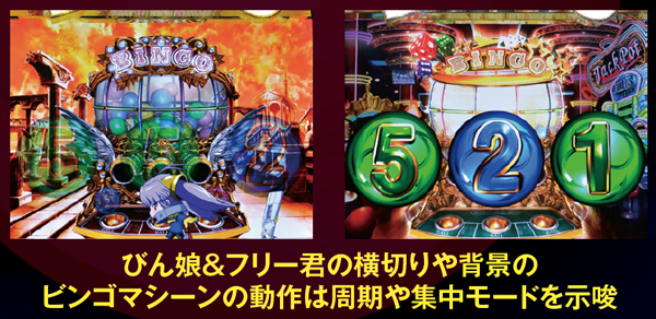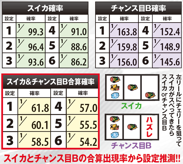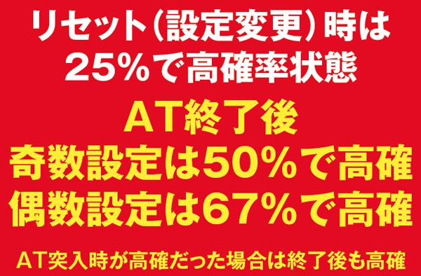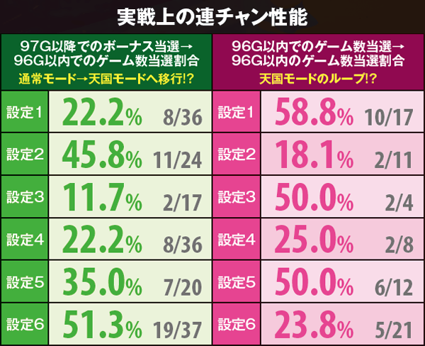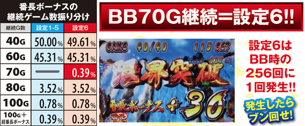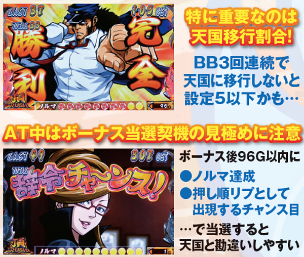 モード移行の特徴は「奇数設定では天国に行きづらいがループしやすく、偶数設定ではループ率こそ低いものの天国に行きやすい」となる。ただし、設定5は奇数設定でも天国移行率が高めなので、概ねBB3~4回で一度も天国移行がないようなら設定4以下の可能性大(あくまでも目安)だ。