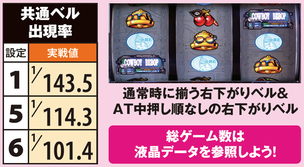 通常時の出現率に設定差のある小役として覚えておきたいのが「共通ベル」(DDT打法実践の際に右下がりに揃うベルで、押忍ベルを除いたもの)。そう大きな差ではないためにあくまでも「参考値」ではあるのだが、共通ベルの出現率が高い台は(低い台よりも)高設定である可能性が高くなる。