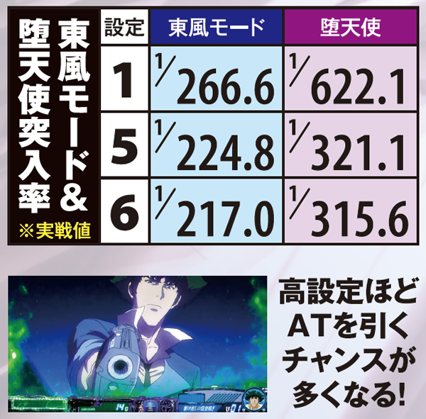 CZ突入率は高設定ほど優遇されている。堕天使は特に設定差が大きいと思われるので、通常時の総ゲーム数&突入回数をチェック。