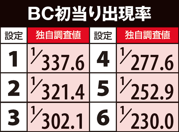 現状判明している唯一の設定推測要素がこの「BC初当り」で、設定1なら337分の1、設定6なら230分の1となかなかの設定差がついている。