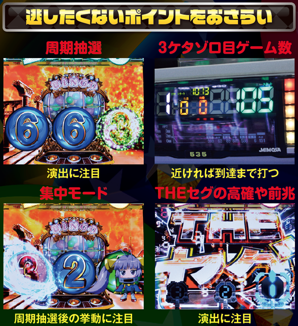 周期抽選、ゾロ目抽選、集中モード、高確や前兆…と、通常時に様々な「おいしいポイント」を備える本機だけに、席を離れる際は細心の注意を払いたい。理想的なヤメ時はロングリーチ3連などで周期抽選の失敗が確定したのち、液晶が大人しくなって集中モードから転落したことを確認した場合だろう。BC終了後も同様に、しばらく回して集中モードの非滞在を確認してからヤメよう。