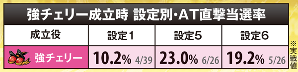 高設定と設定1とでは強チェリーからのAT直撃当選率に大きな差が見られた。この挙動が幾度となく確認できれば粘る価値ありといえそうだ。