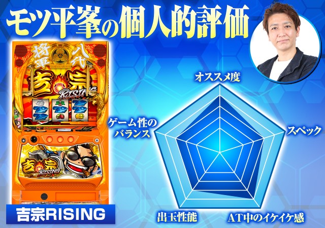 AT「爆走大盤振舞」は純増約4.0枚/Gの差枚数管理型AT。消化中はライジングチャレンジポイント獲得抽選や枚数上乗せ抽選をおこなっていて、AT終了後は必ず引き戻しゾーン「八代将軍チャレンジ」へ移行します。