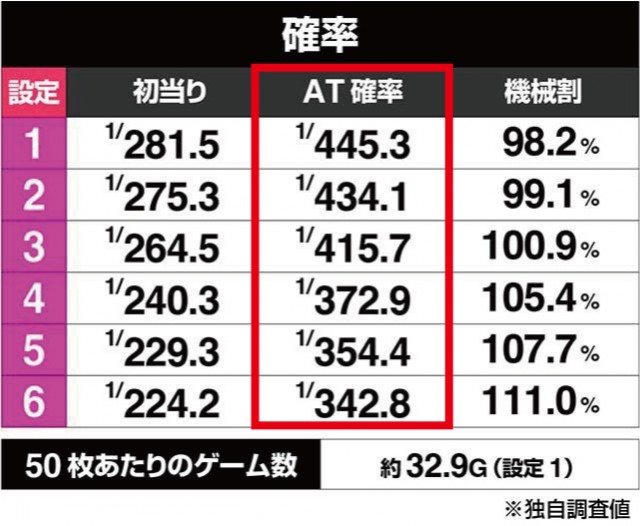 とはいえ、安定した勝利にはやはりAT初当りをより多くゲットしたいもの。設定6-①はAT直撃に加えてATの「初当り確率」も優秀で、CZ「パニックゾーン」の当選率も他データより抜けていました。