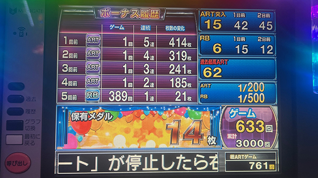 昨日のこの時間と同じように、当たっても伸びないATが続き、1500枚くらいノマれました。ナイターじゃないと出ないんでしょうか。