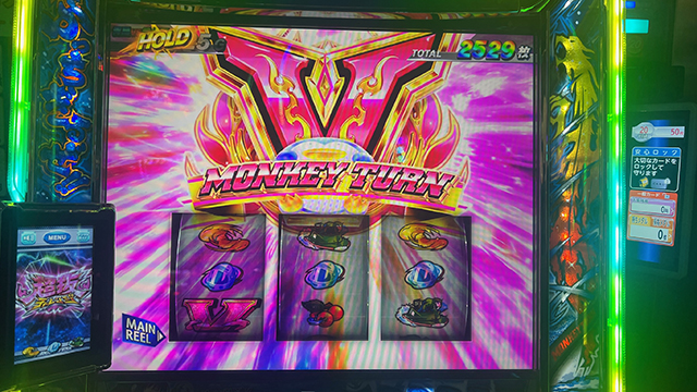 人気機種の『パチスロ からくりサーカス』や『パチスロ 革命機ヴァルヴレイヴ』『バジ絆2天膳』は前の人たちで埋まっていきます。そんな中、僕の選んだ機種は『スマスロ モンキーターンV』です。