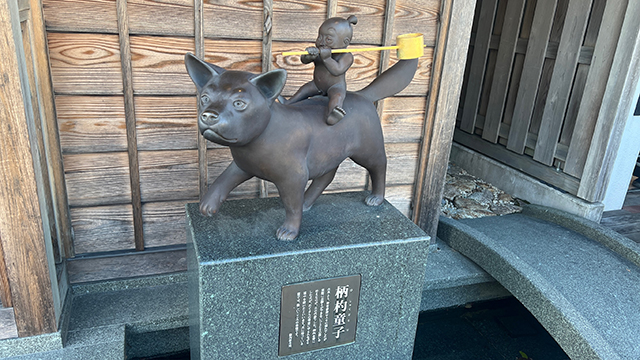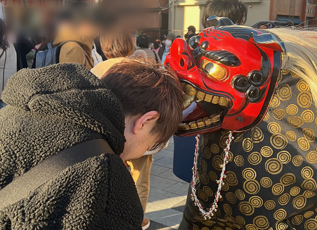 伊勢うどんを食べ、柄杓童子を撫で、手水舎で手を洗い、獅子舞に頭を噛んでもらいました。