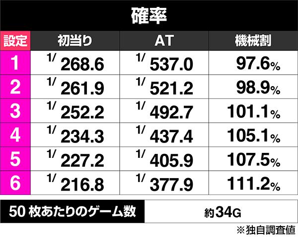注目すべきはAT確率で、設定1と6で約1.4倍ほどの差が存在する。判別する際は、最低でも1/400前後を判断基準にしたいところだ。