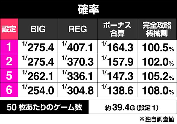 もちろん完全攻略時は設定1でも機械割が100%を超えている甘いスペックなのだが、やはり設定に準じて機械割も上がっていくので、ひとつでも上の設定を目指したいところ。