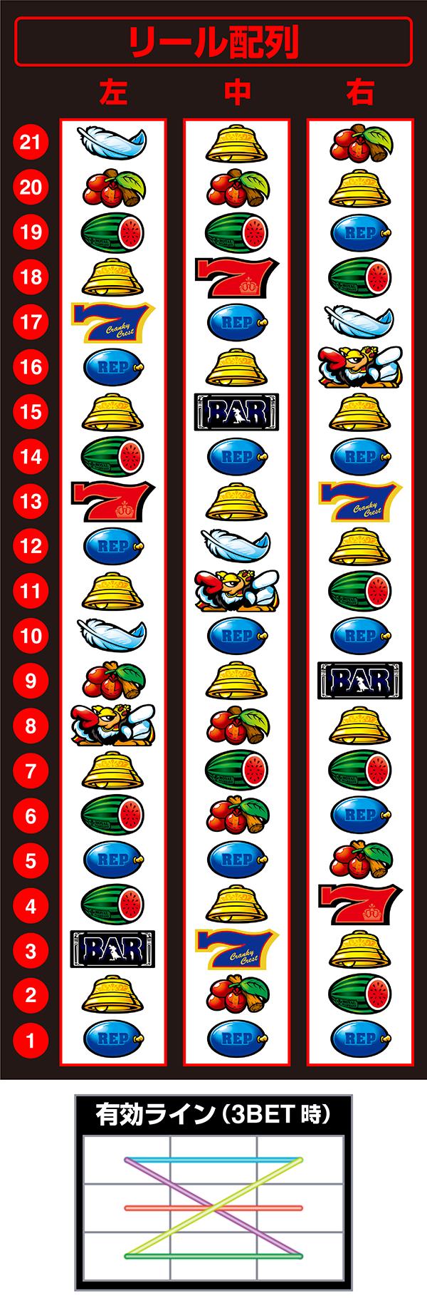 まずは配列からチェックしていこう。これまでのシリーズとは停止出目が異なる部分が賛否両論を呼んでいるが、小役に関しては難しい打ち方をしなくてもしっかりと奪取できる配列になっている。