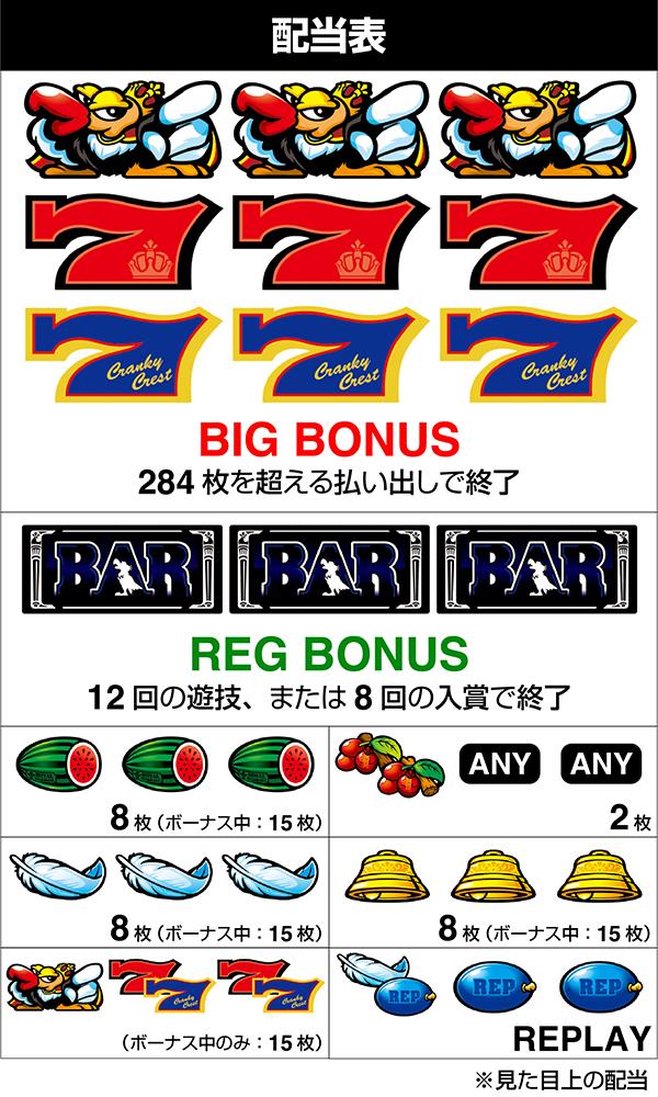 『クランキー』シリーズはスイカが15枚だった機種があるが、本機においては8枚役。取りこぼしによる損失は少なくなったものの、塵も積もれば山となる。