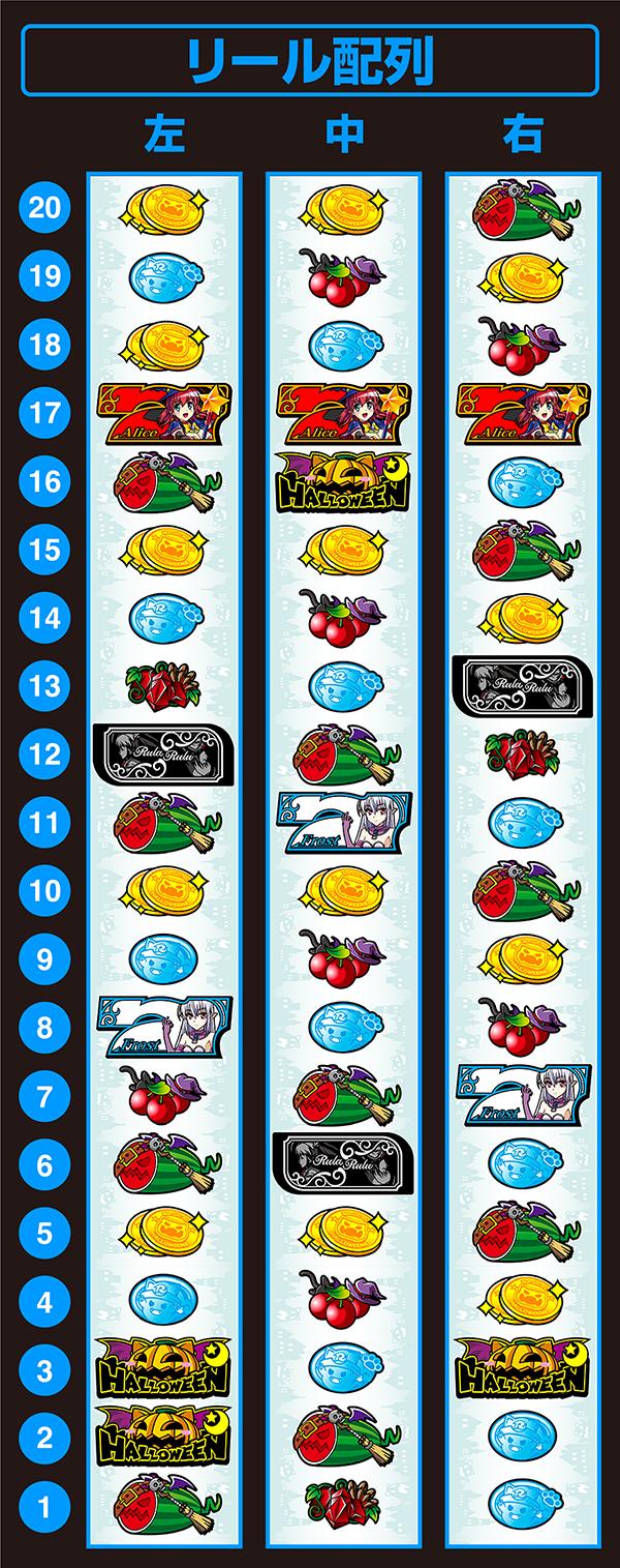 こちらもカボチャが揃えばボーナス! ただし、右下がりにリプレイが揃った場合でも赤7BIGとなる。また、中段一直線にカボチャが揃った場合は中段チェリーの代用出目だ。