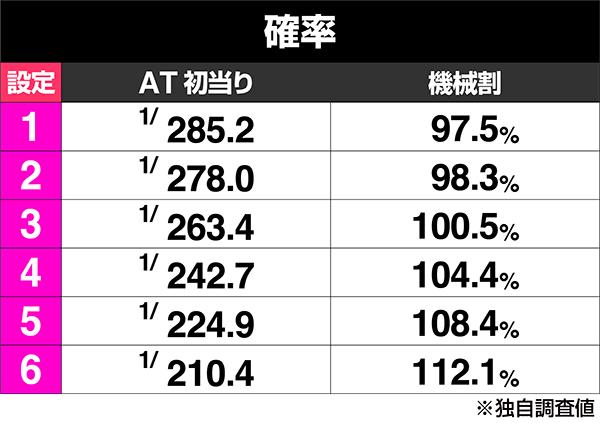 高設定ほど初当りが軽く、設定6だと1/210.4とサクサク初当りを楽しめる仕様。また、機械割も112.1%と高く、優秀な数値を誇っている。