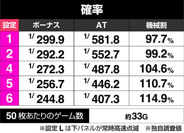 機械割に関しては昨今のAT機同様に設定6の機械割が上限の114.9%をマーク。設定5でも110.7%あるので、高設定であるならば期待値を十分に備えたマシンと言えよう。
