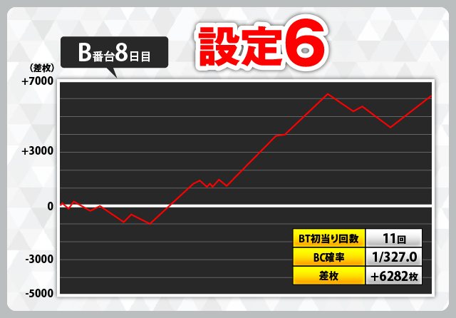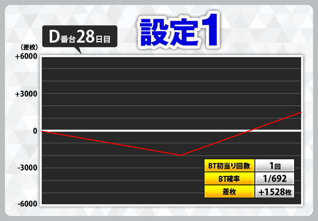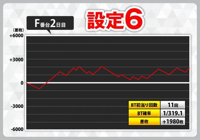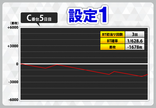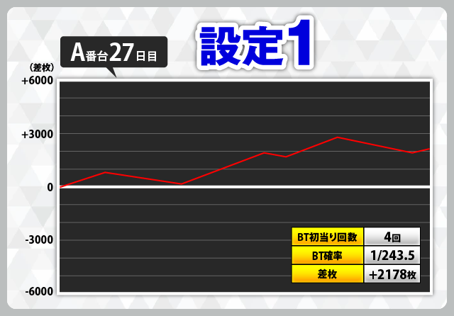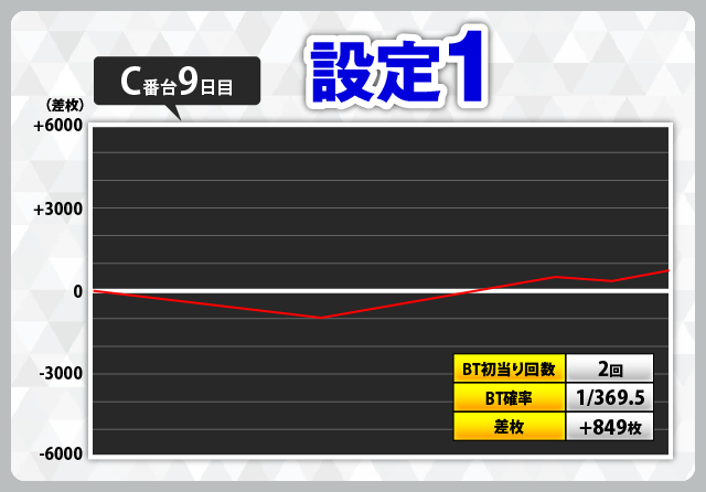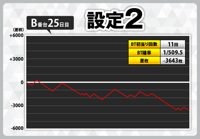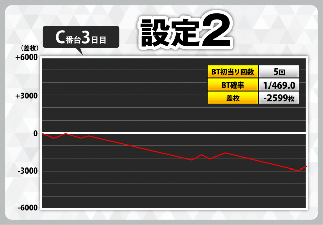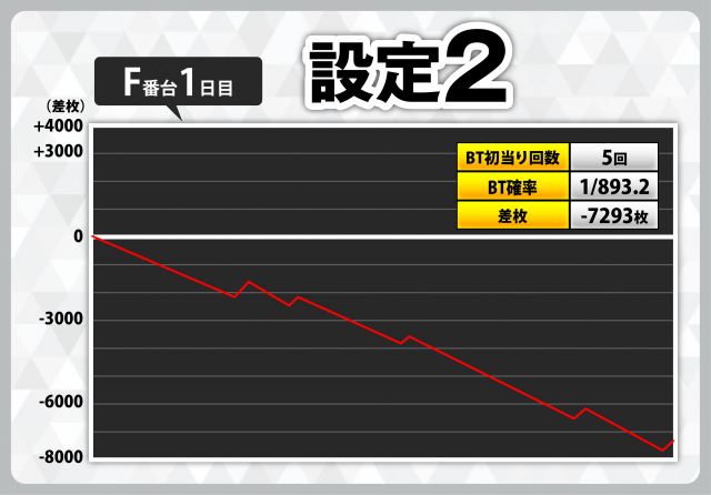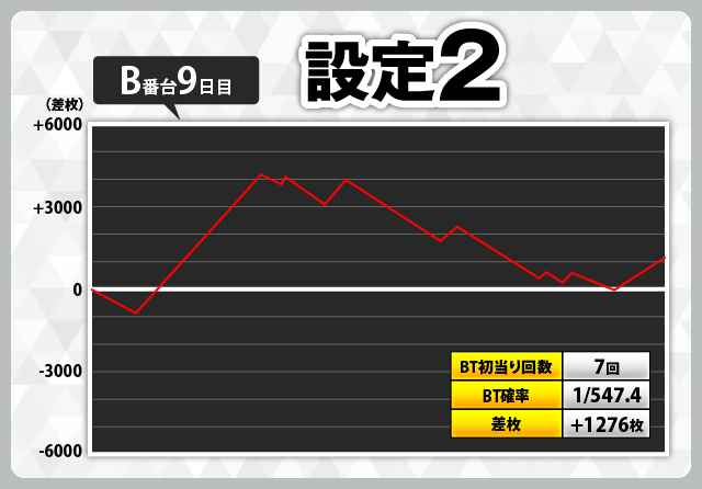 | 2 | +7644枚(設定3) | −6538枚(設定1) |