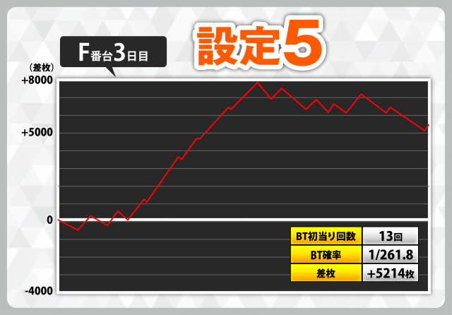 ただ、スランプグラフを見ると、初日のF番台が設定2で7000枚、5日目のA番台が設定1で6500枚以上、どちらもほぼストレートで負けているように、打感だけでは設定1と設定2にどのような違いがあるのか分かりづらいような気がします。