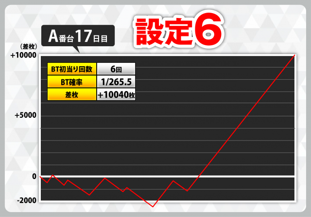 その成果か、17日目A番台の設定6が見事万枚を達成し、出玉でもしっかりとアピールすることができた印象です。