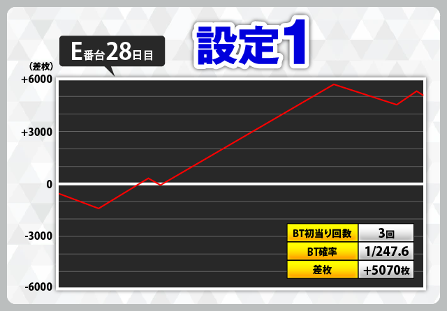 スランプグラフから読み取れるのは、BTの初当りの確率よりもどこかで一撃伸ばせるかどうかの方がはるかに重要な台ということです。