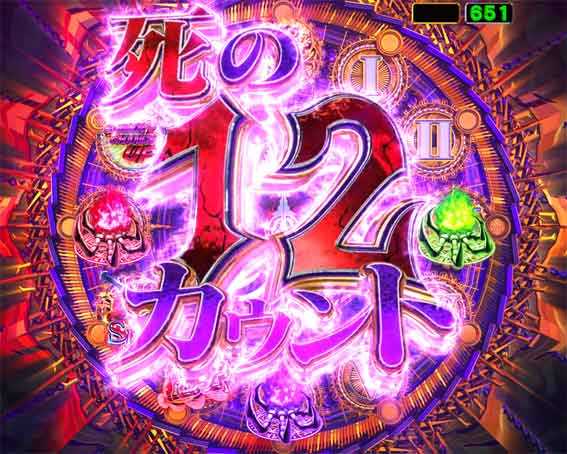 「死の12カウント」は擬似連継続時などに発生し、SPリーチ発展へのメインルートとなる重要演出です。12カウント到達前にテンパイした場合はリーチへ発展。12カウント到達なら、大チャンス演出の「極悪ATTACK」が発生します!