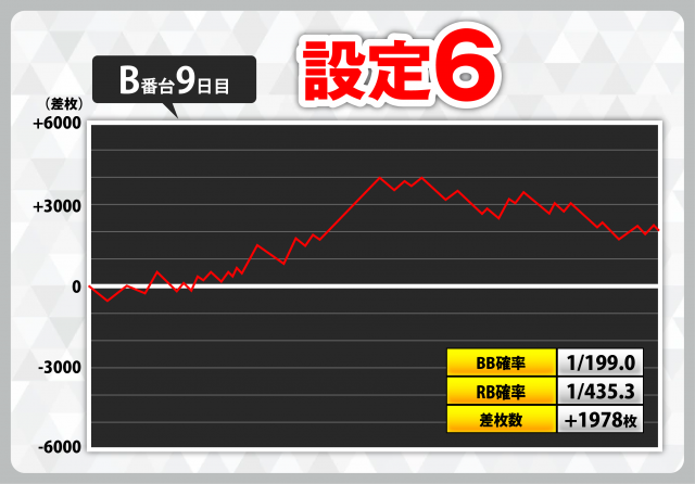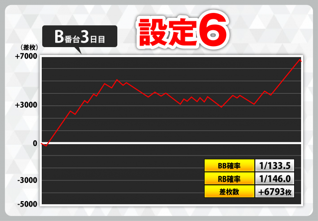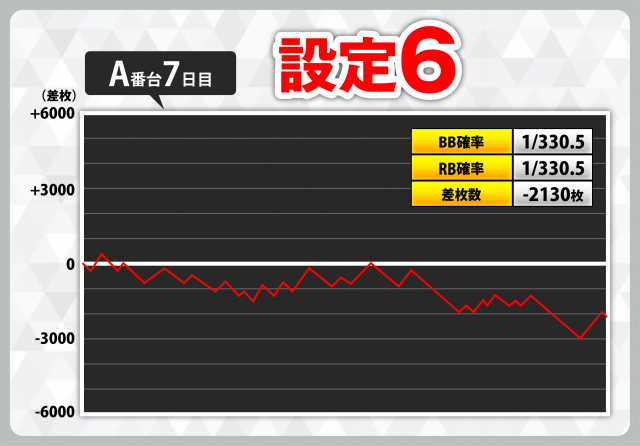 1週間で設定6は2台使用されましたが、3日目のB番台が+6793枚、7日目のA番台が-2130枚と、かなりはっきりと明暗が分かれました。