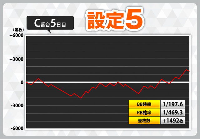 ただ、大きな出玉は少なく、設定5の2台は約500枚と1500枚のプラス、設定6は1台だけ約6700枚というものがあるものの、プラスになった他の2台は約1000枚と2000枚。