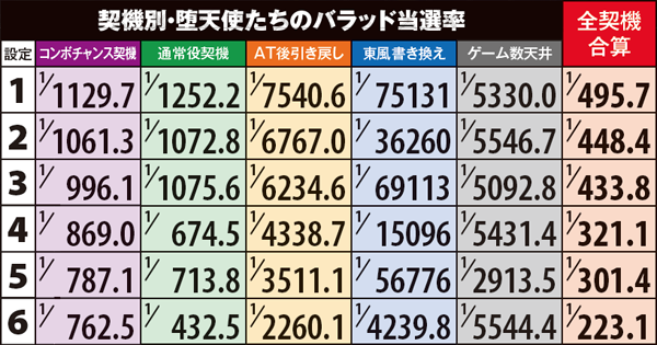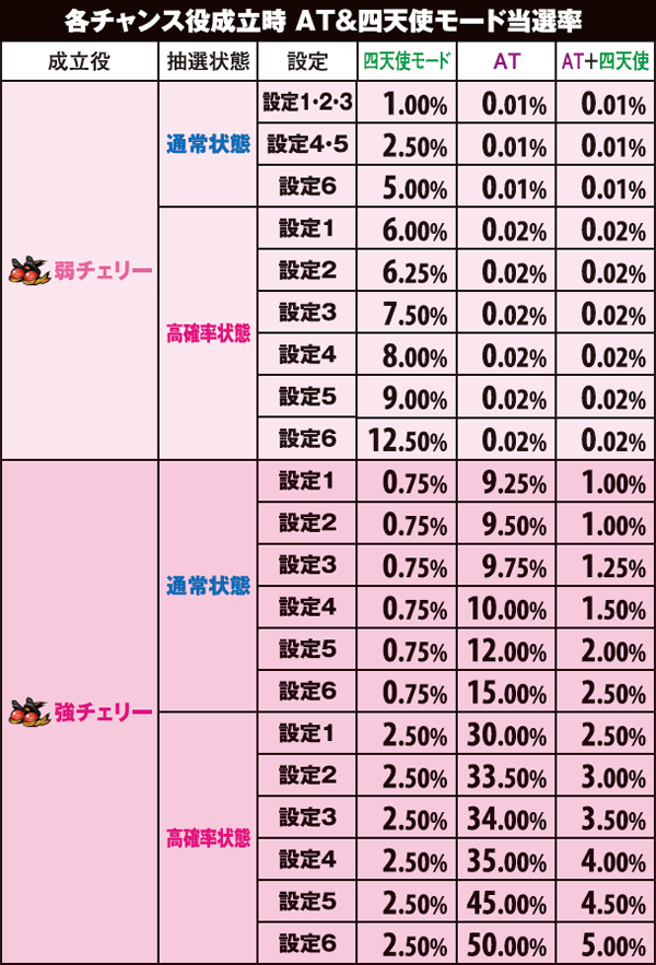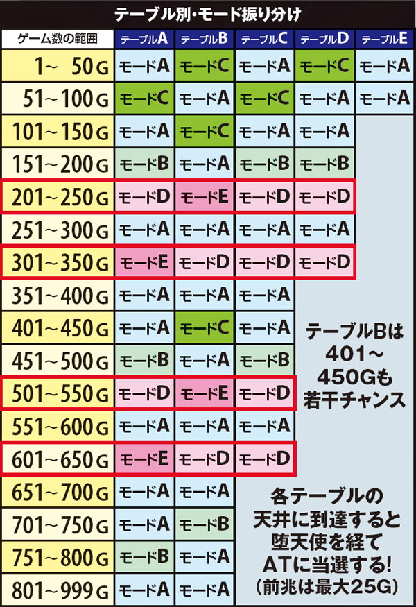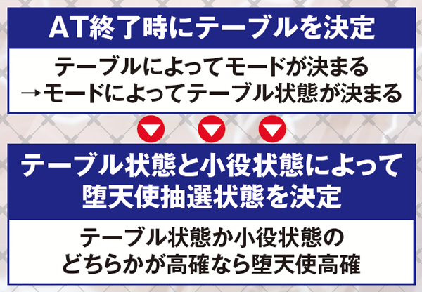 上記4つのゾーンでは、通常以上が確定するモードDまたはモードEに滞在しているので、堕天使当選の大チャンス。ただし、これ以外のゾーンでも、小役状態が高確であれば同じく堕天使高確となる。