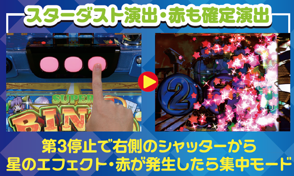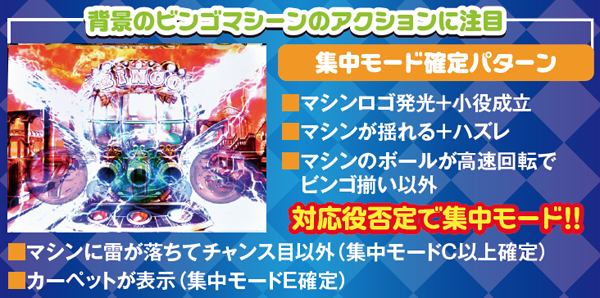 数ある演出の中でも特に重要なのがこの集中モード確定演出で、特にSDキャラは集中モードC以上が確定するパターンが多いので見落とし厳禁。基本的にキャラが左からくるとアツいという法則は覚えておこう。ビンゴマシーン演出は対応役が決まっているので、こちらも要暗記だ。