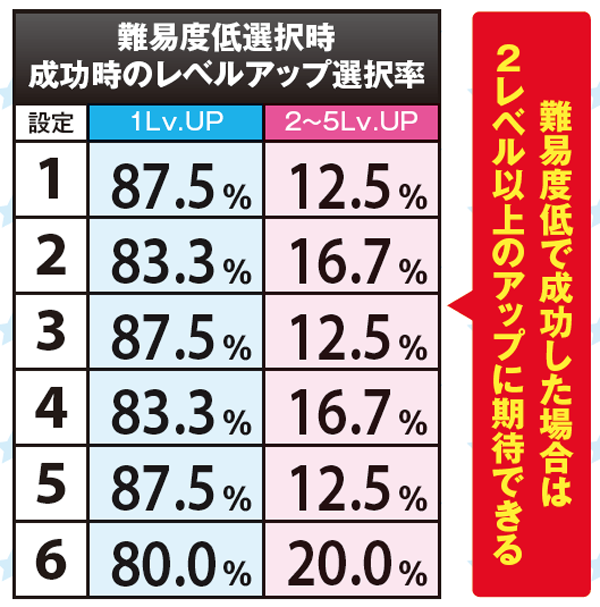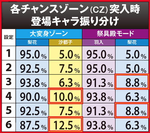 大変身ゾーン時のLv.5で復活パターンが発生すれば設定4以上が確定。高設定ほど発生率が高まるため、設定4以上というだけでなく設定6の可能性も大きく高まる。