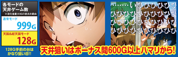 JAC中の登場キャラは前作同様、高設定示唆要素が含まれている。登場キャラは何回目のJACなのかにも注目したい。また、ボーナス終了画面で羽入がいれば、次回天国が確定するため絶対に128Gまでは消化しよう。天国へ移行しなくとも、ボーナス後は高確からのスタートに期待できるため即ヤメは危険だ。