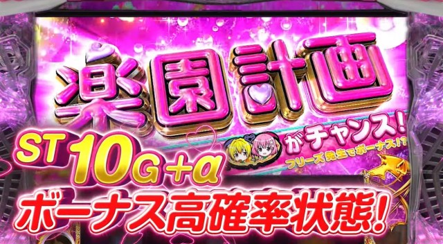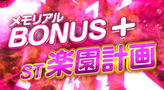 初当りは全てメモリアルBONUS +ST「楽園計画」を獲得する仕様。このSTが10G+αのボーナス高確率状態となり、ボーナス→ST→ボーナス→ST…といった具合に出玉を増やしていくゲーム性の様子。