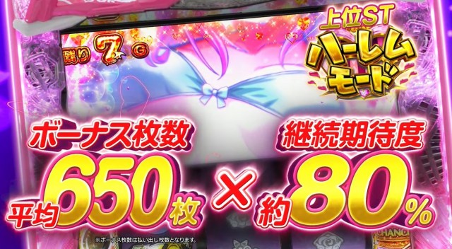 ST突入率は直通当りと時短引き戻しの合算で約70%。ST「ハーレムTIME」は140回転でST中の大当り確率は1/97、継続率は約77%となっている。