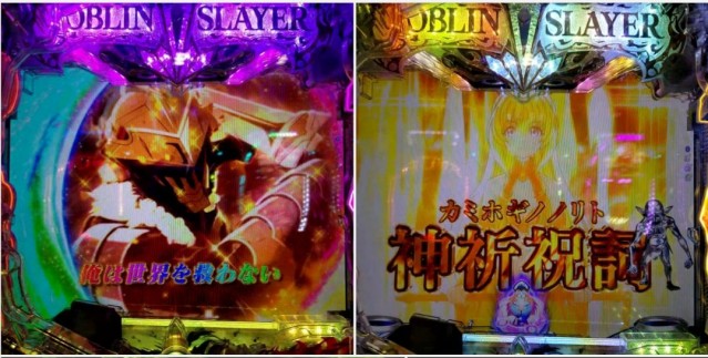 『Pゴブリンスレイヤー』にて、神祈祝詞成功のテンパイから虹テロップで大当りをゲットですねん!