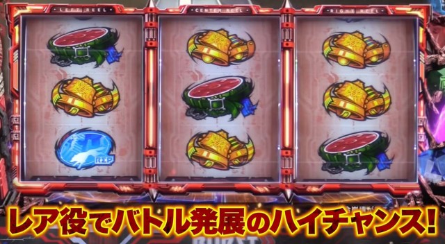 初代同様にリプレイ・レア役が鍵を握るゲーム性が継承され、AT中はリプレイでバトル発展のチャンス。レア役ならハイチャンスとなり、バトルの勝利期待度は平均76%とのこと。