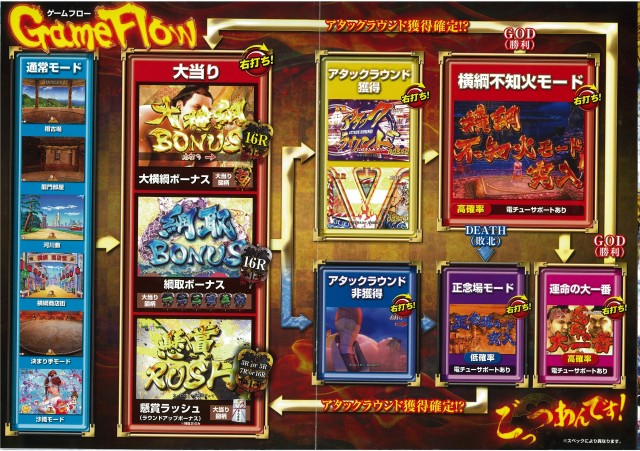 ゲームフローは、まず通常時では6つの背景となり、7図柄停止の大当たりでは16R確変で「大横綱BONUS」へ。アタックラウンドへの権利を獲得出来る。