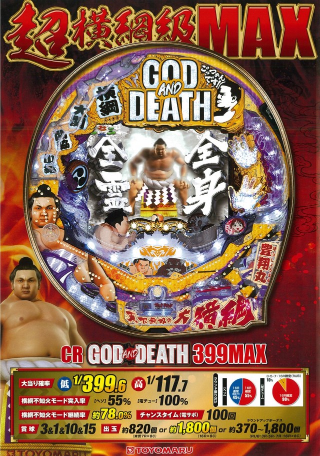 本機は「相撲」そして、その世界の頂点に君臨する「横綱」という勝負に関する題材をモチーフにしたため、あえて甘いパチンコではなく横綱級のパチンコを広めるという事でMAXになったと説明。