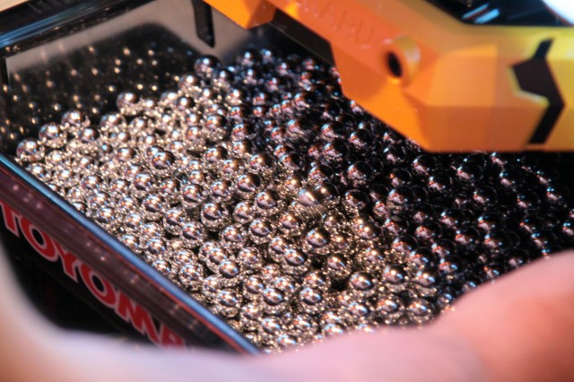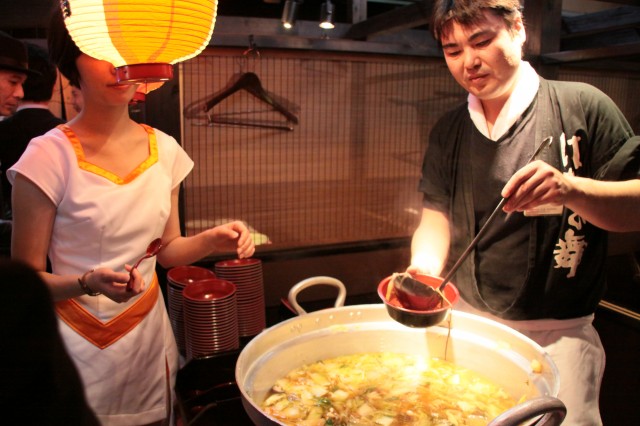 最後には早めの忘年会とばかりに同社から、「串カツタワー」や、巨大鍋で作られた「ちゃんこ鍋」「バクダンおにぎり」他、豪快に盛られた料理が振る舞われる中、試打も行われ花の舞は非日常な雰囲気に包まれていた。