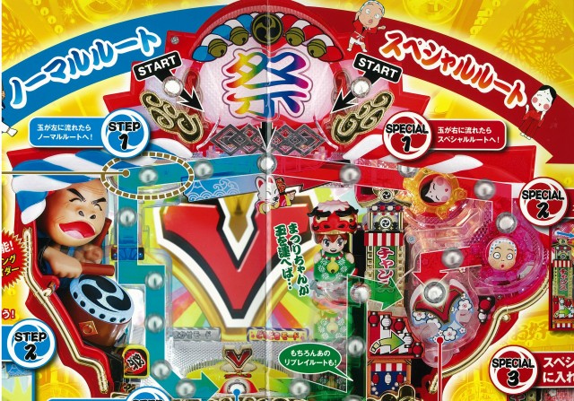 そして、羽根モノで旋風を巻き起こしたリプレイルートも搭載!ノーマルルートのVゾーンクルーンの対角線上にリプレイゾーンがあり、そこに玉が入ると『ポチっと一発!おだてブタ』役物を継承した獅子舞に扮する『まつりちゃん』の出番。『まつりちゃん』がスペシャルVゾーン目がけて玉を運んでくれるギミックは思わず手に汗握る瞬間だ。