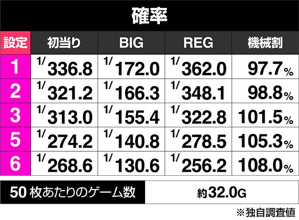 簡易スペックは上の表の通り。初当りは全モードを加味した初当り確率だと思われる。BIGとREGの各種数値は連チャンも込みでの数字と理解しよう。