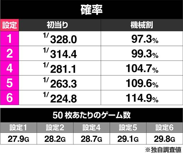 ただ、高設定ほどボーナス確率が高くなっているのは言わずもがな、さらに設定6の初当り確率は他設定よりも抜きんでているのが特徴と言えよう。